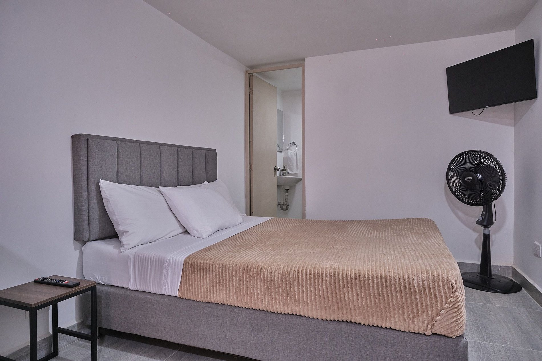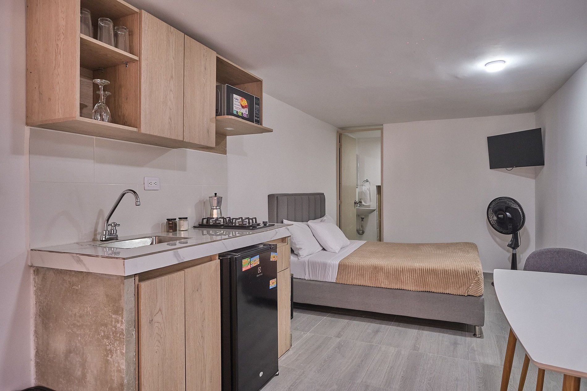 Cuenta con una cómoda cama doble de 1.40 cm con mesa de noche, y un baño privado con agua caliente, completamente equipado con toallas, papel higiénico y jabón corporal. La cocina a gas natural está totalmente equipada con microondas, nevera, ollas, vasos, copas, utensilios de cocina, vajilla completa y una cafetera con café y azúcar de cortesía, ideal para disfrutar tus comidas o un buen café por la mañana.