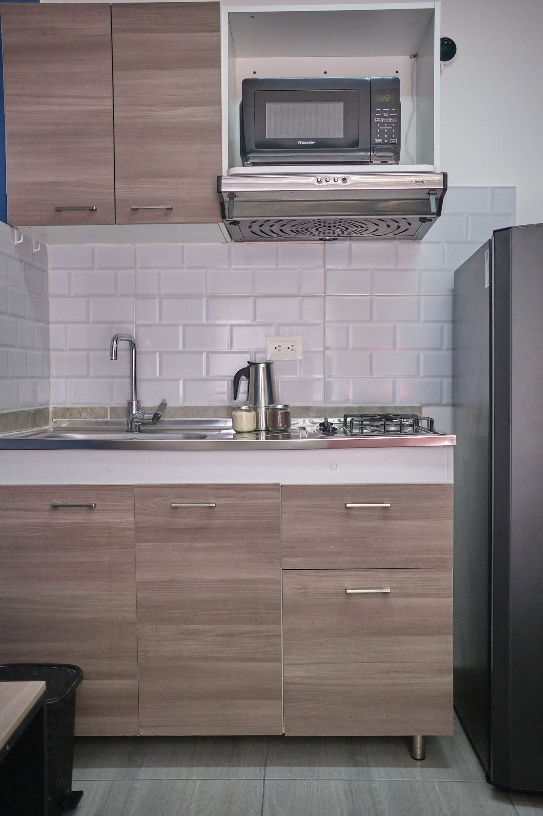 The loft’s kitchen is outfitted with natural gas, a microwave, refrigerator, pots, glasses, cups, a complete set of dishes, and essential cooking utensils. To start your day with energy, enjoy a complimentary coffee and sugar setup. Relax while watching your favorite shows on a 32-inch TV with Netflix and air channels, and take advantage of the dining table, which also doubles as a comfortable workspace.