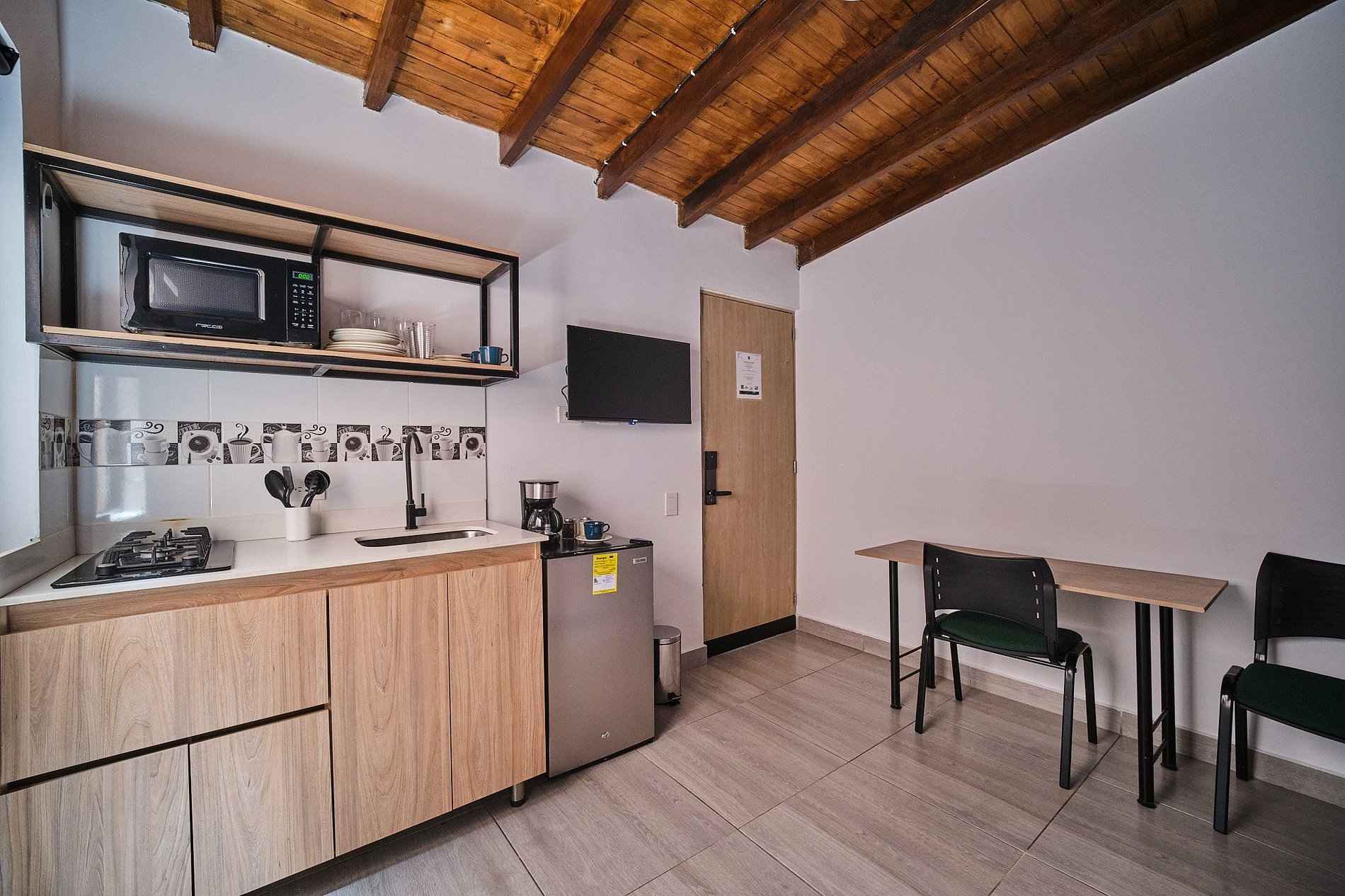 La cocina es completamente independiente y está equipada con todo lo necesario para tu día a día: nevera, utensilios, vajilla, ollas y espacio para preparar tus alimentos o disfrutar un café con total comodidad.