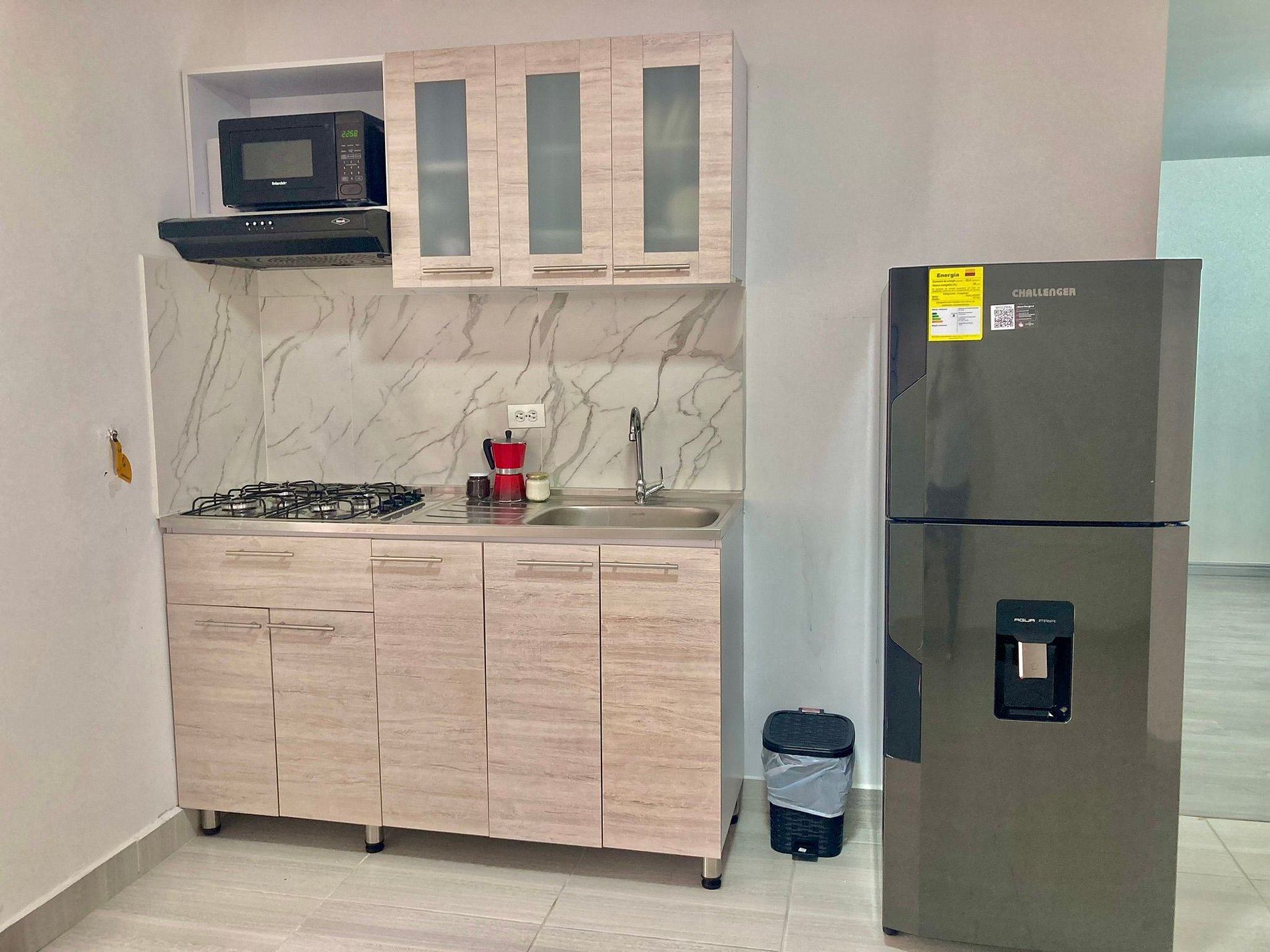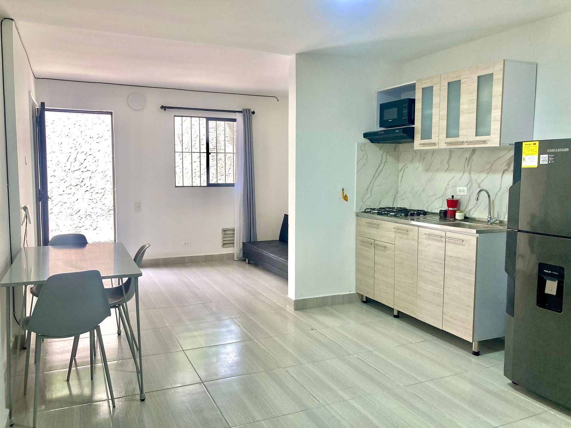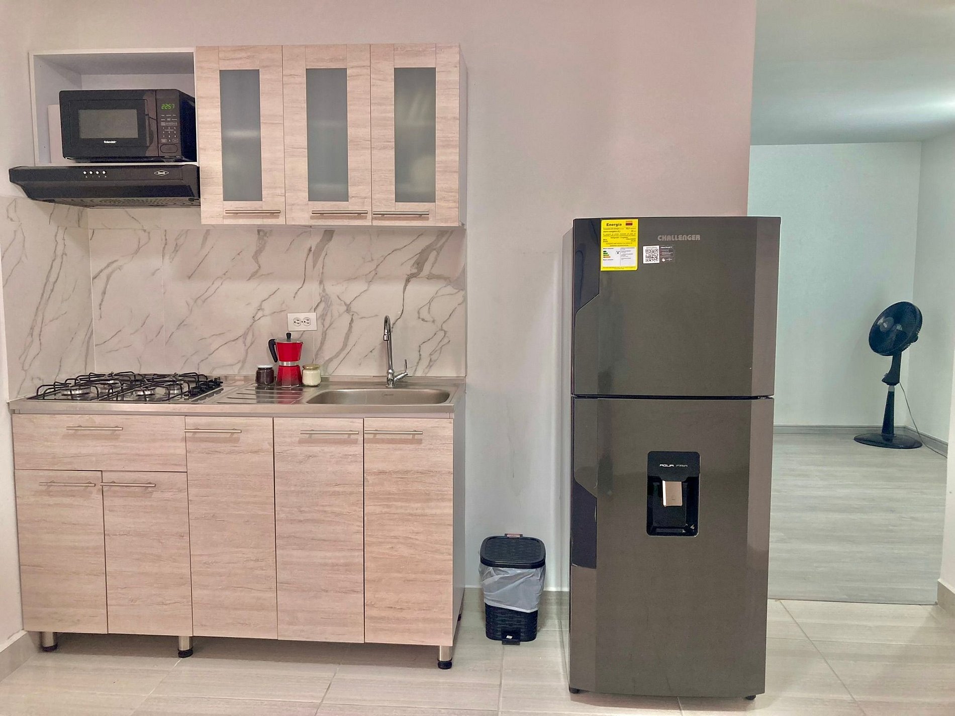 Este acogedor y funcional espacio está diseñado para ofrecerte una estancia cómoda y práctica. Cuenta con una cama doble de 1.40 m y una mesa de noche ideal para tu comodidad. El baño independiente incluye agua caliente, toallas, papel higiénico y jabón corporal. La cocina, con gas natural, está completamente equipada con microondas, nevera, vajilla, ollas, utensilios, vasos, copas y una cafetera con café y azúcar para que comiences el día con energía. Disfruta de tus series favoritas en el televisor de 32” con acceso a Netflix y canales nacionales. El espacio también incluye un clóset con ganchos para ropa, un comedor y una mesa independiente como zona de trabajo, ideal para viajes de negocios o estancias largas.