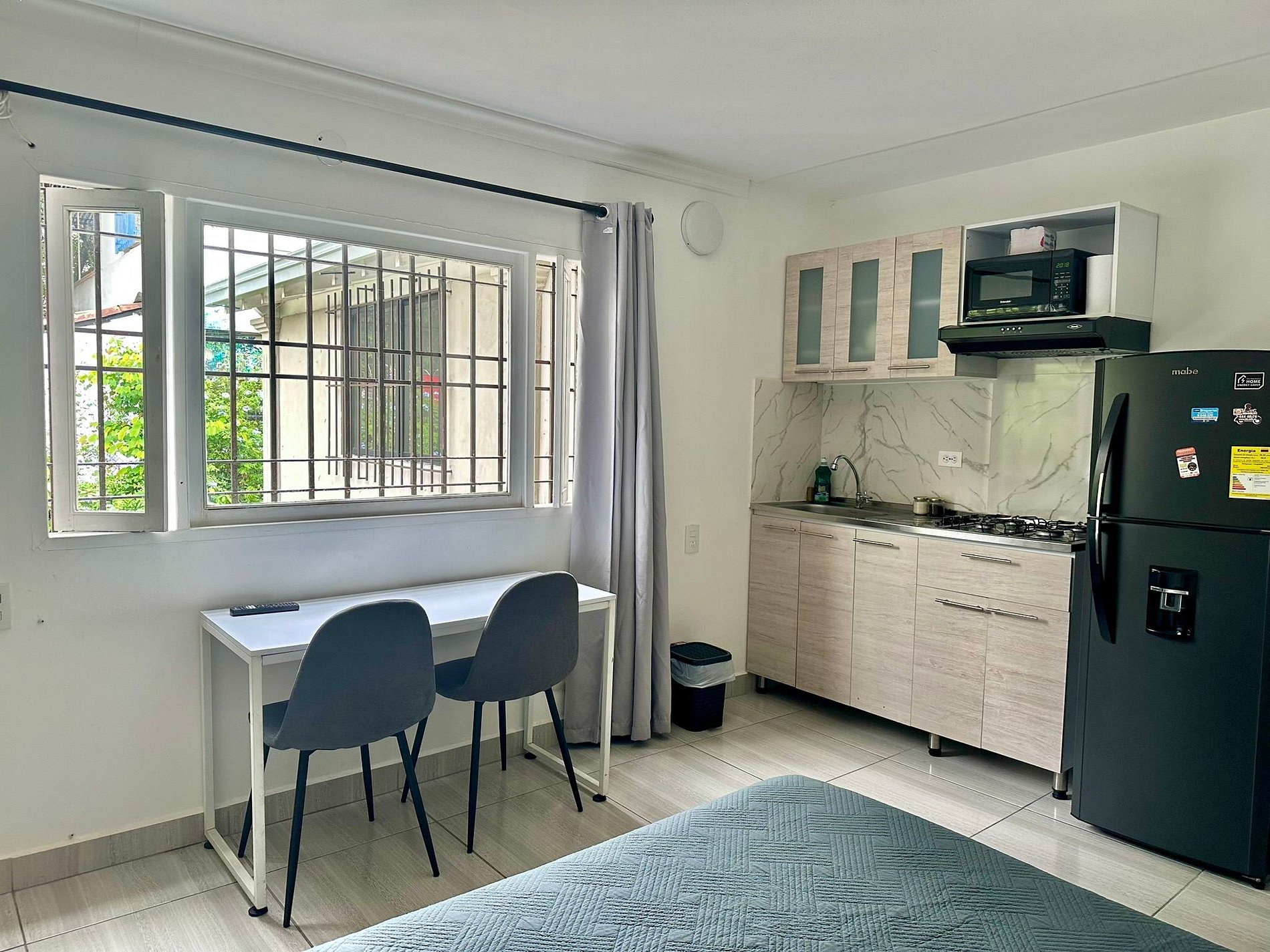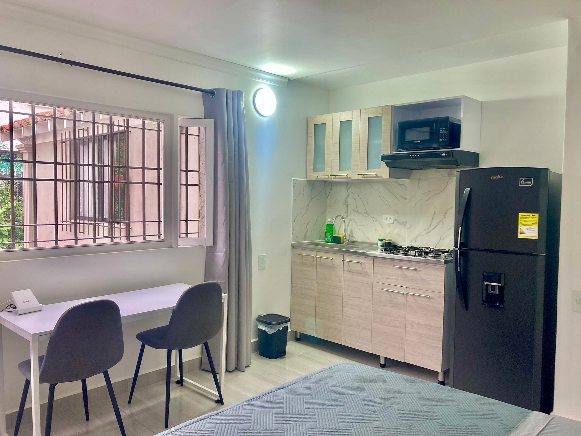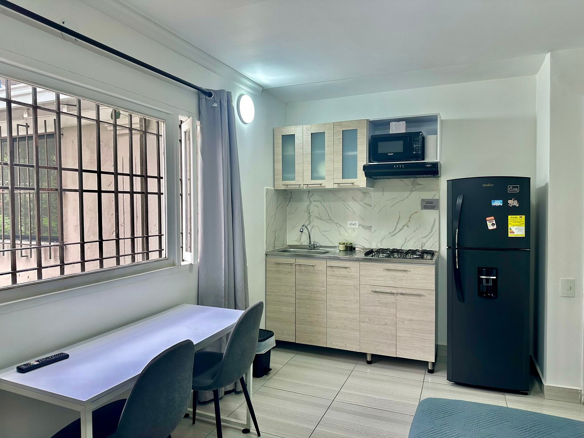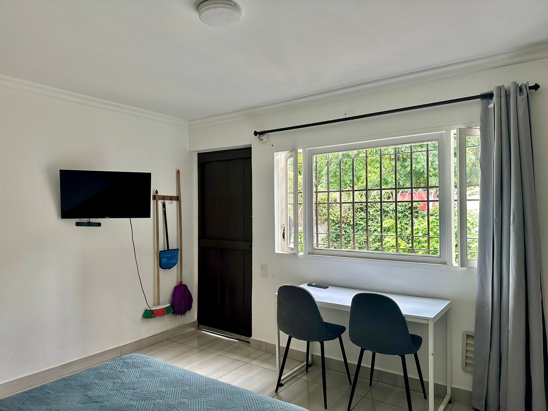 Este acogedor y funcional espacio está diseñado para ofrecerte una estancia cómoda y práctica. Cuenta con una cama doble de 1.40 m y una mesa de noche ideal para tu comodidad. El baño independiente incluye agua caliente, toallas, papel higiénico y jabón corporal. La cocina, con gas natural, está completamente equipada con microondas, nevera, vajilla, ollas, utensilios, vasos, copas y una cafetera con café y azúcar para que comiences el día con energía. Disfruta de tus series favoritas en el televisor de 32” con acceso a Netflix y canales nacionales. El espacio también incluye un clóset con ganchos para ropa, un comedor y una mesa independiente como zona de trabajo, ideal para viajes de negocios o estancias largas.