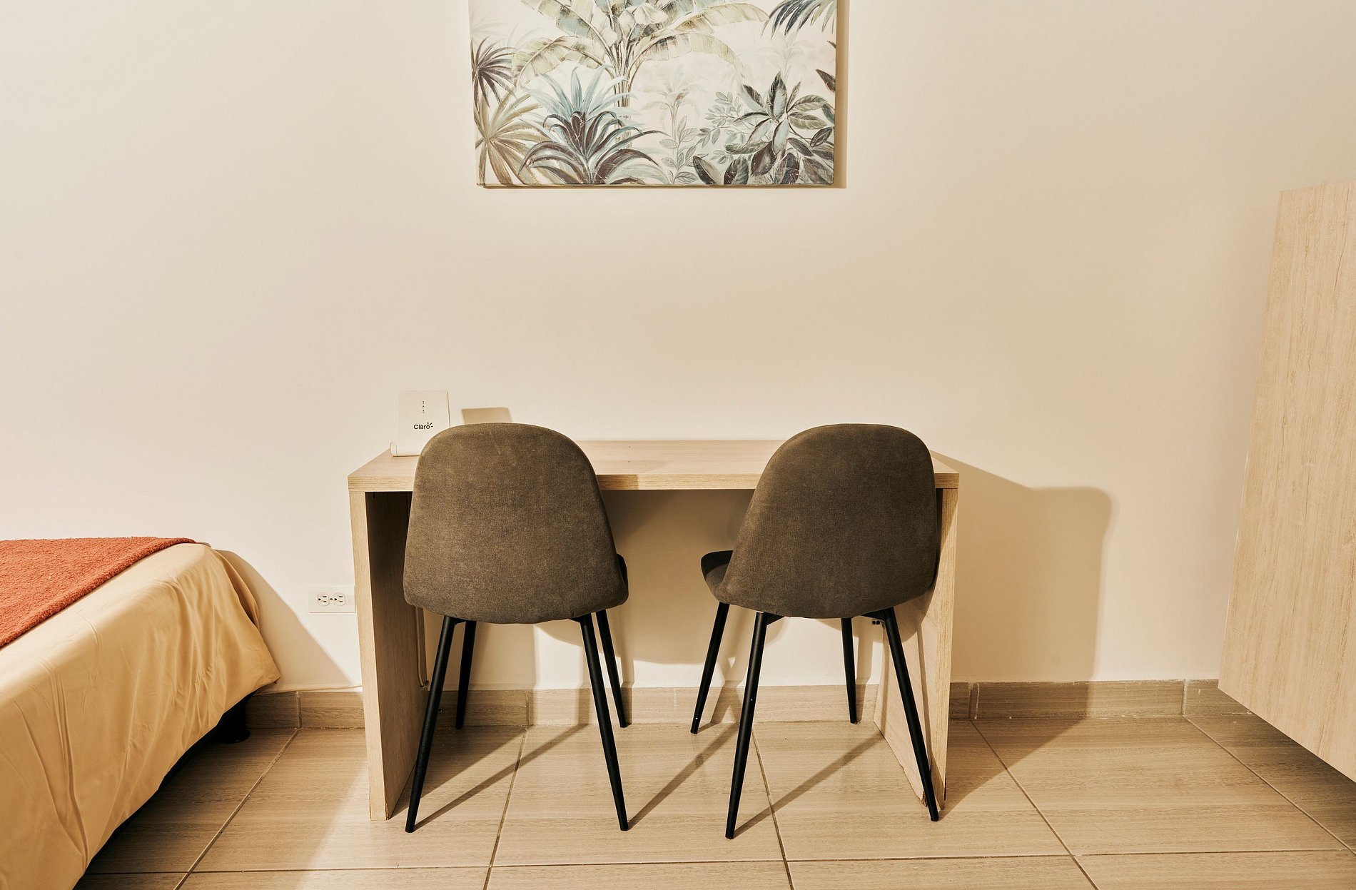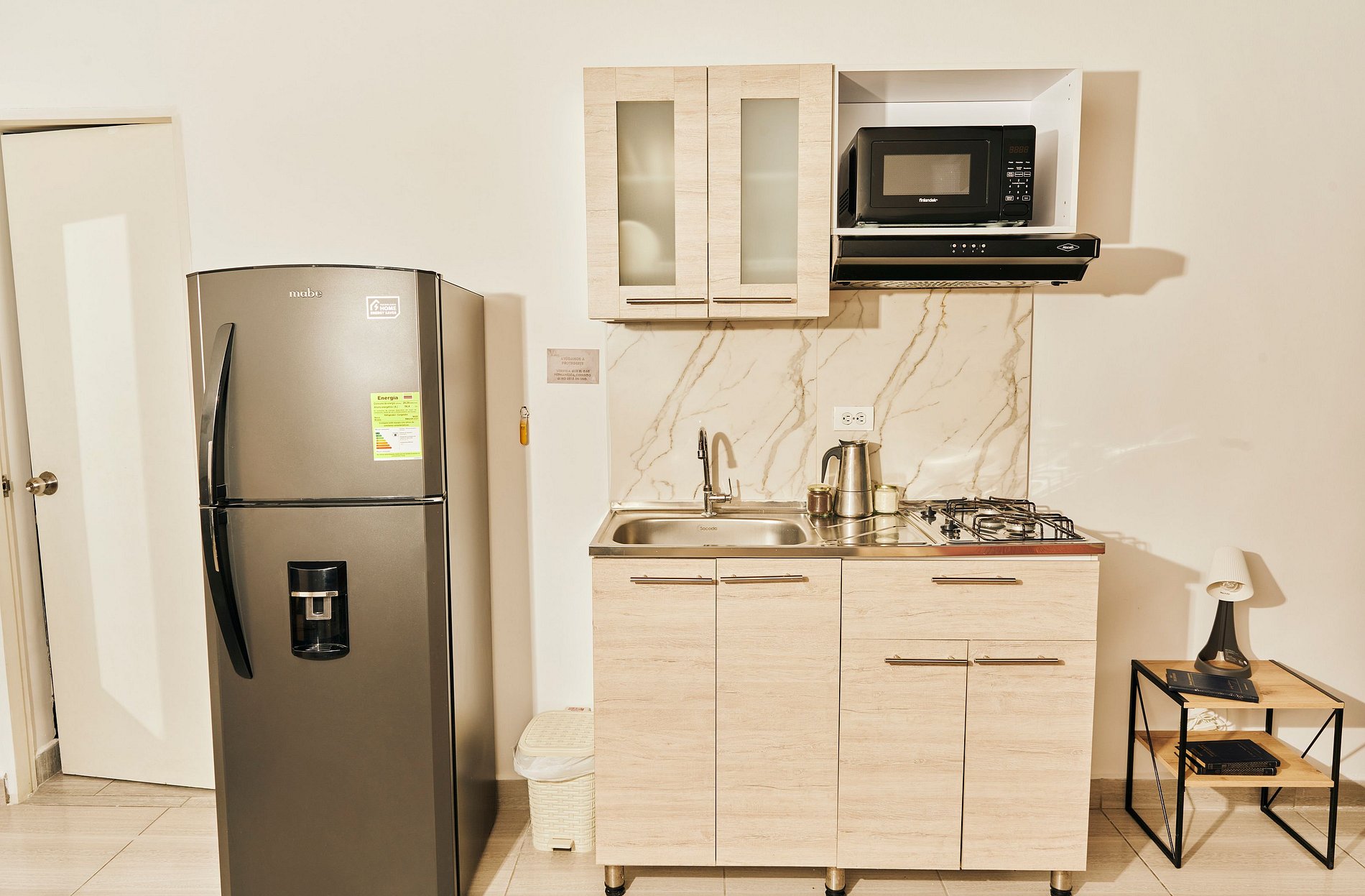 Este acogedor y funcional espacio está diseñado para ofrecerte una estancia cómoda y práctica. Cuenta con una cama doble de 1.40 m y una mesa de noche ideal para tu comodidad. El baño independiente incluye agua caliente, toallas, papel higiénico y jabón corporal. La cocina, con gas natural, está completamente equipada con microondas, nevera, vajilla, ollas, utensilios, vasos, copas y una cafetera con café y azúcar para que comiences el día con energía. Disfruta de tus series favoritas en el televisor de 32” con acceso a Netflix y canales nacionales. El espacio también incluye un clóset con ganchos para ropa, un comedor y una mesa independiente como zona de trabajo, ideal para viajes de negocios o estancias largas.