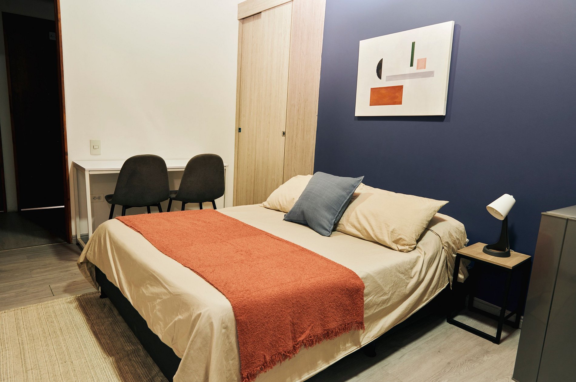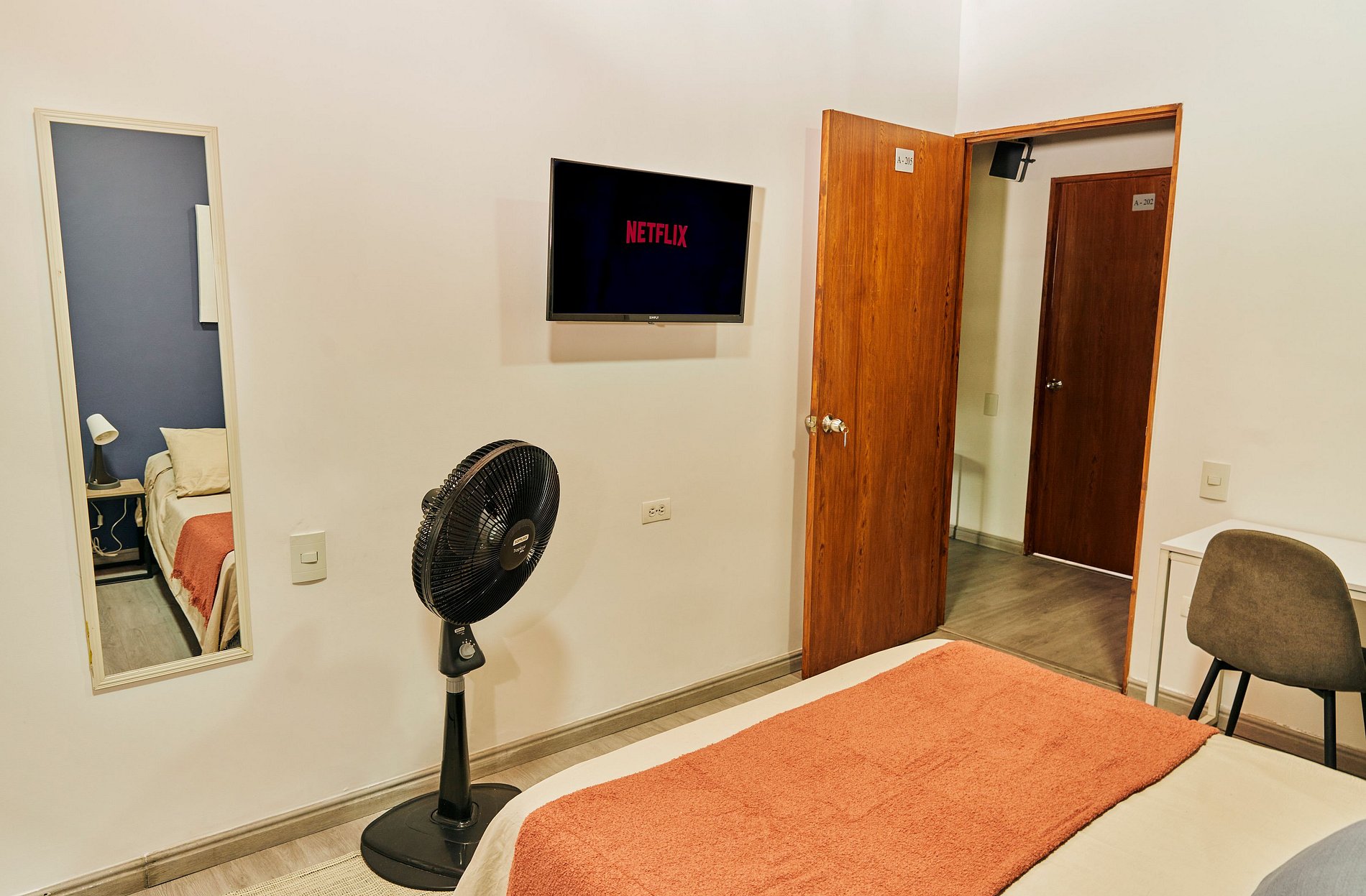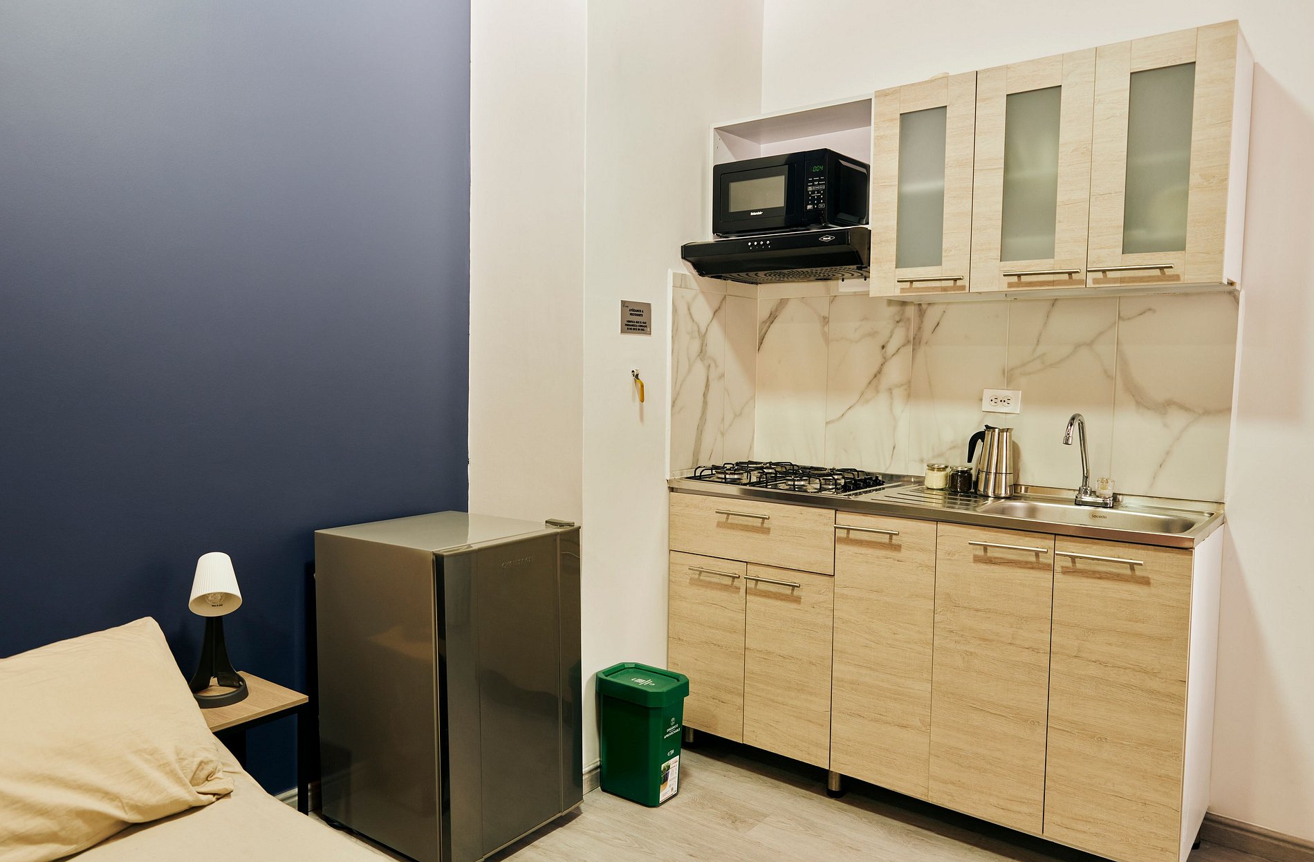 Este acogedor y funcional espacio está diseñado para ofrecerte una estancia cómoda y práctica. Cuenta con una cama doble de 1.40 m y una mesa de noche ideal para tu comodidad. El baño independiente incluye agua caliente, toallas, papel higiénico y jabón corporal. La cocina, con gas natural, está completamente equipada con microondas, nevera, vajilla, ollas, utensilios, vasos, copas y una cafetera con café y azúcar para que comiences el día con energía. Disfruta de tus series favoritas en el televisor de 32” con acceso a Netflix y canales nacionales. El espacio también incluye un clóset con ganchos para ropa, un comedor y una mesa independiente como zona de trabajo, ideal para viajes de negocios o estancias largas.