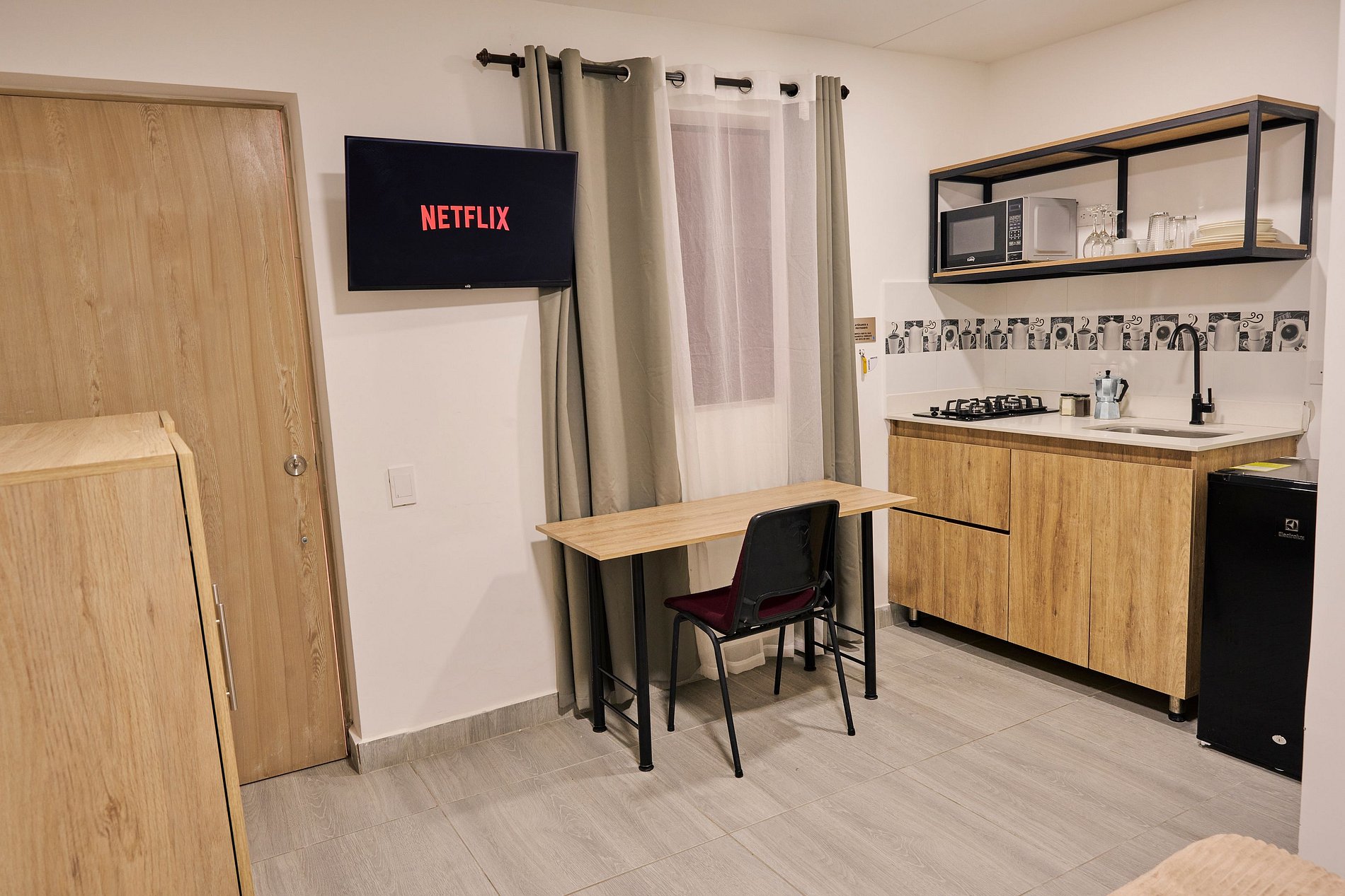 Este espacio ofrece todo el confort que necesitas. Dispone de una cama doble de 1.40 cm con mesa de noche, y un baño privado con agua caliente, equipado con toallas, papel higiénico y jabón corporal. La cocina, que funciona con gas natural, está totalmente equipada con microondas, nevera, ollas, vasos, copas, utensilios de cocina, vajilla completa, y una cafetera con suministro de café y azúcar para tu comodidad. Además, el apartamento cuenta con un televisor de 32 pulgadas con suscripción a Netflix y canales de aire. El clóset incluye ganchos para la ropa, y también dispones de un comedor y una mesa de trabajo para mayor funcionalidad.