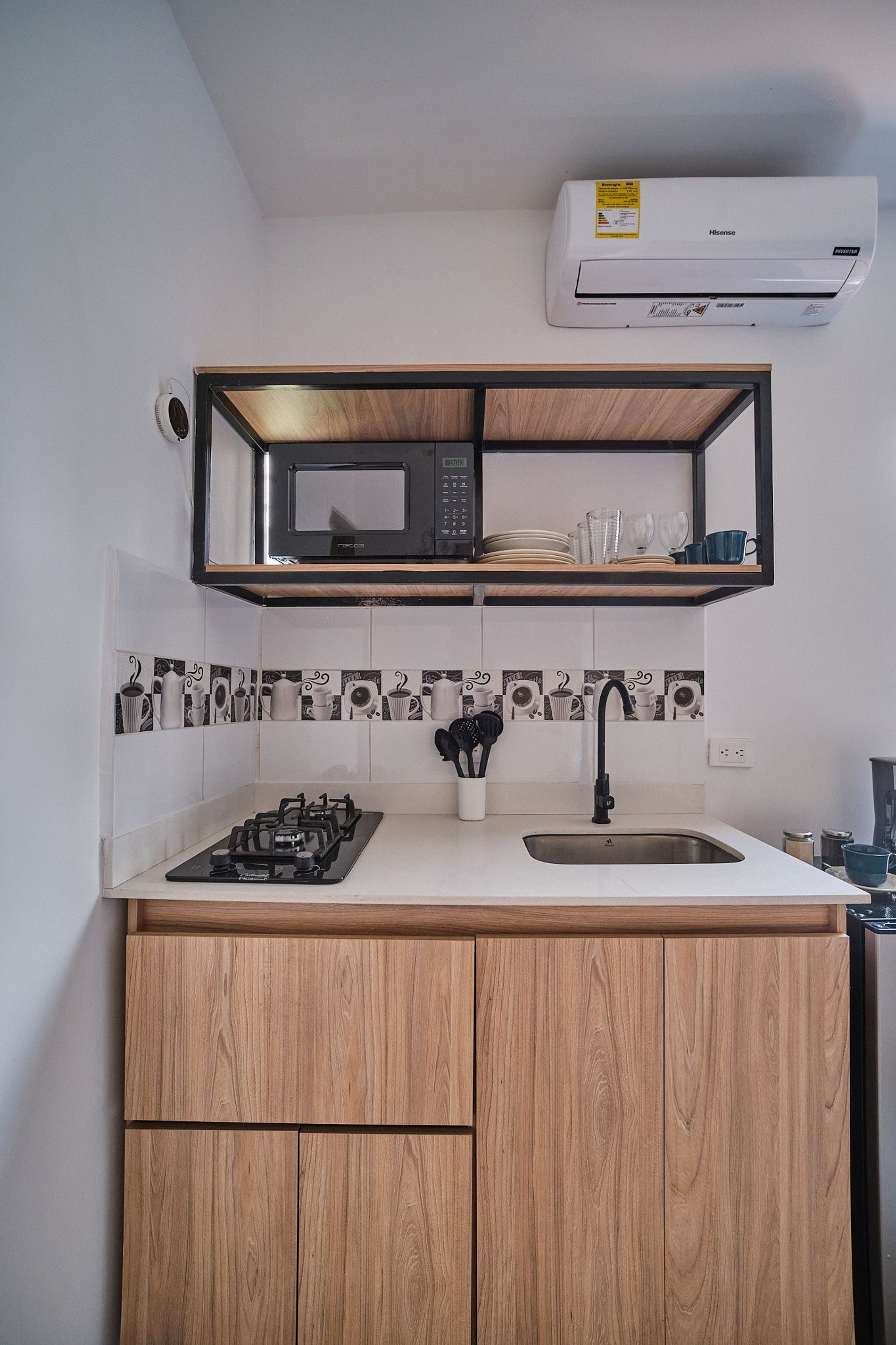 La cocina es completamente independiente y está equipada con todo lo necesario para tu día a día: nevera, utensilios, vajilla, ollas y espacio para preparar tus alimentos o disfrutar un café con total comodidad.