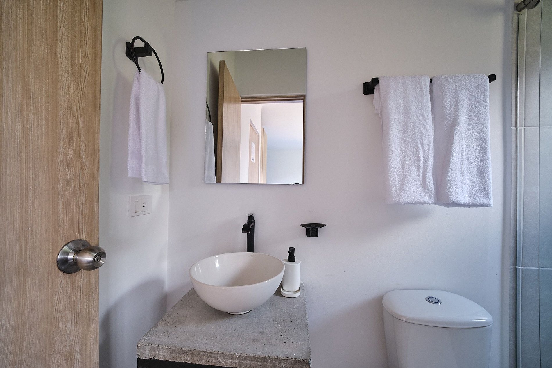 El loft dispone de aire acondicionado para mayor comodidad, además de un baño privado con cabina en vidrio, agua caliente y los elementos esenciales como toallas, papel higiénico y jabón.