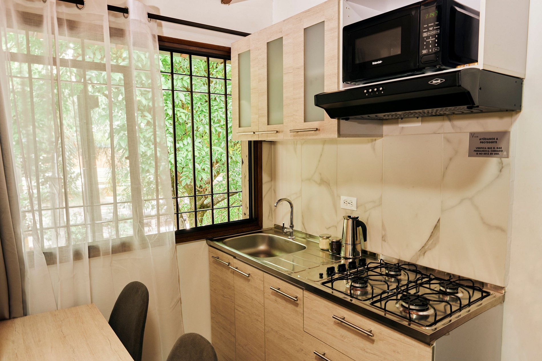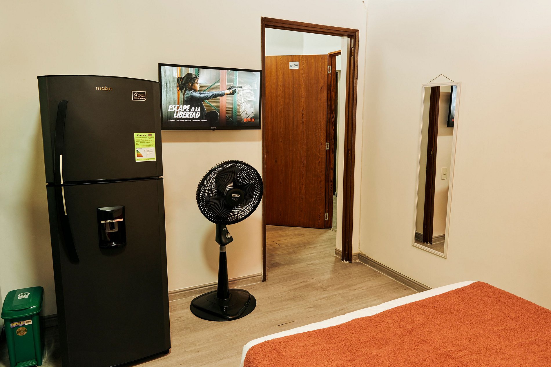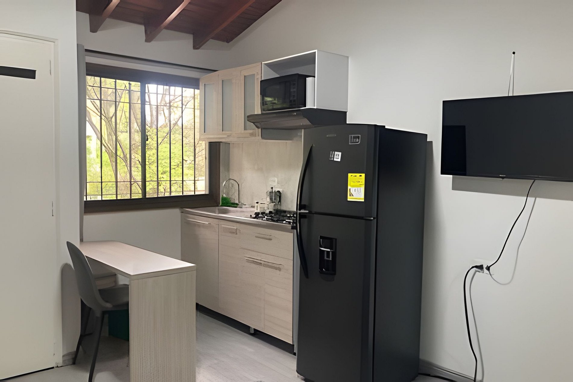 Este acogedor y funcional espacio está diseñado para ofrecerte una estancia cómoda y práctica. Cuenta con una cama doble de 1.40 m y una mesa de noche ideal para tu comodidad. El baño independiente incluye agua caliente, toallas, papel higiénico y jabón corporal. La cocina, con gas natural, está completamente equipada con microondas, nevera, vajilla, ollas, utensilios, vasos, copas y una cafetera con café y azúcar para que comiences el día con energía. Disfruta de tus series favoritas en el televisor de 32” con acceso a Netflix y canales nacionales. El espacio también incluye un clóset con ganchos para ropa, un comedor y una mesa independiente como zona de trabajo, ideal para viajes de negocios o estancias largas.