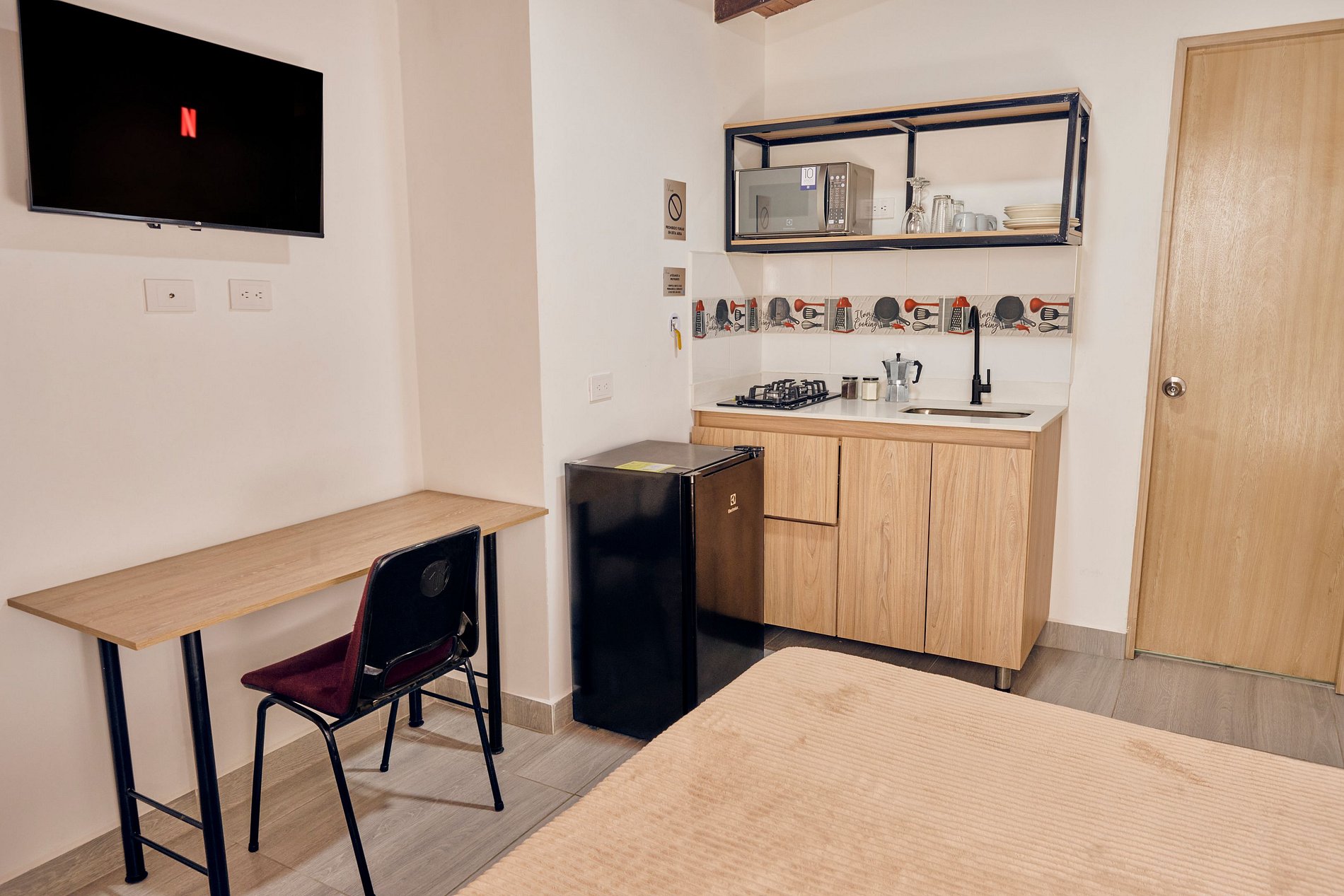 Este espacio ofrece todo el confort que necesitas. Dispone de una cama doble de 1.40 cm con mesa de noche, y un baño privado con agua caliente, equipado con toallas, papel higiénico y jabón corporal. La cocina, que funciona con gas natural, está totalmente equipada con microondas, nevera, ollas, vasos, copas, utensilios de cocina, vajilla completa, y una cafetera con suministro de café y azúcar para tu comodidad. Además, el apartamento cuenta con un televisor de 32 pulgadas con suscripción a Netflix y canales de aire. El clóset incluye ganchos para la ropa, y también dispones de un comedor y una mesa de trabajo para mayor funcionalidad.