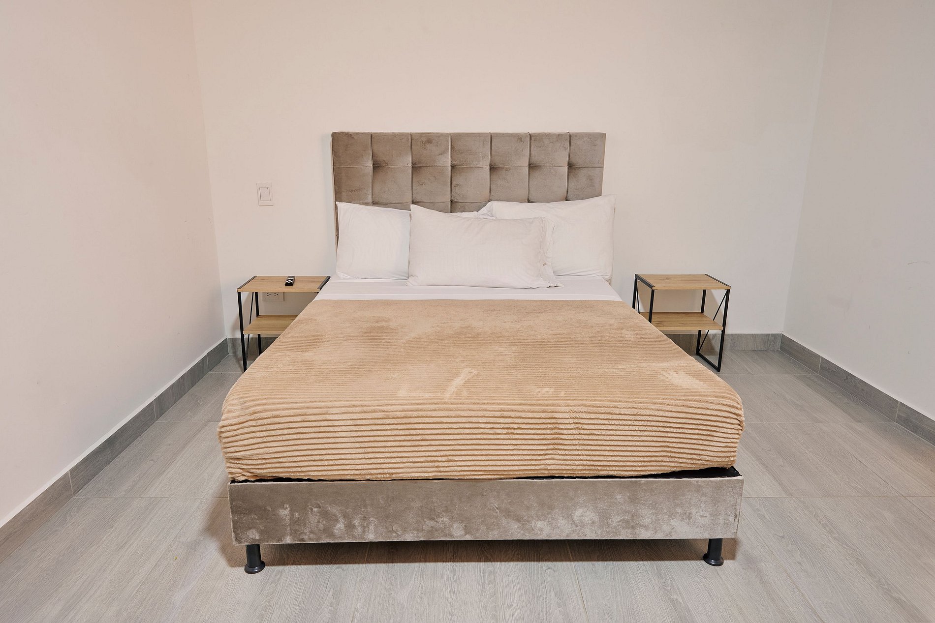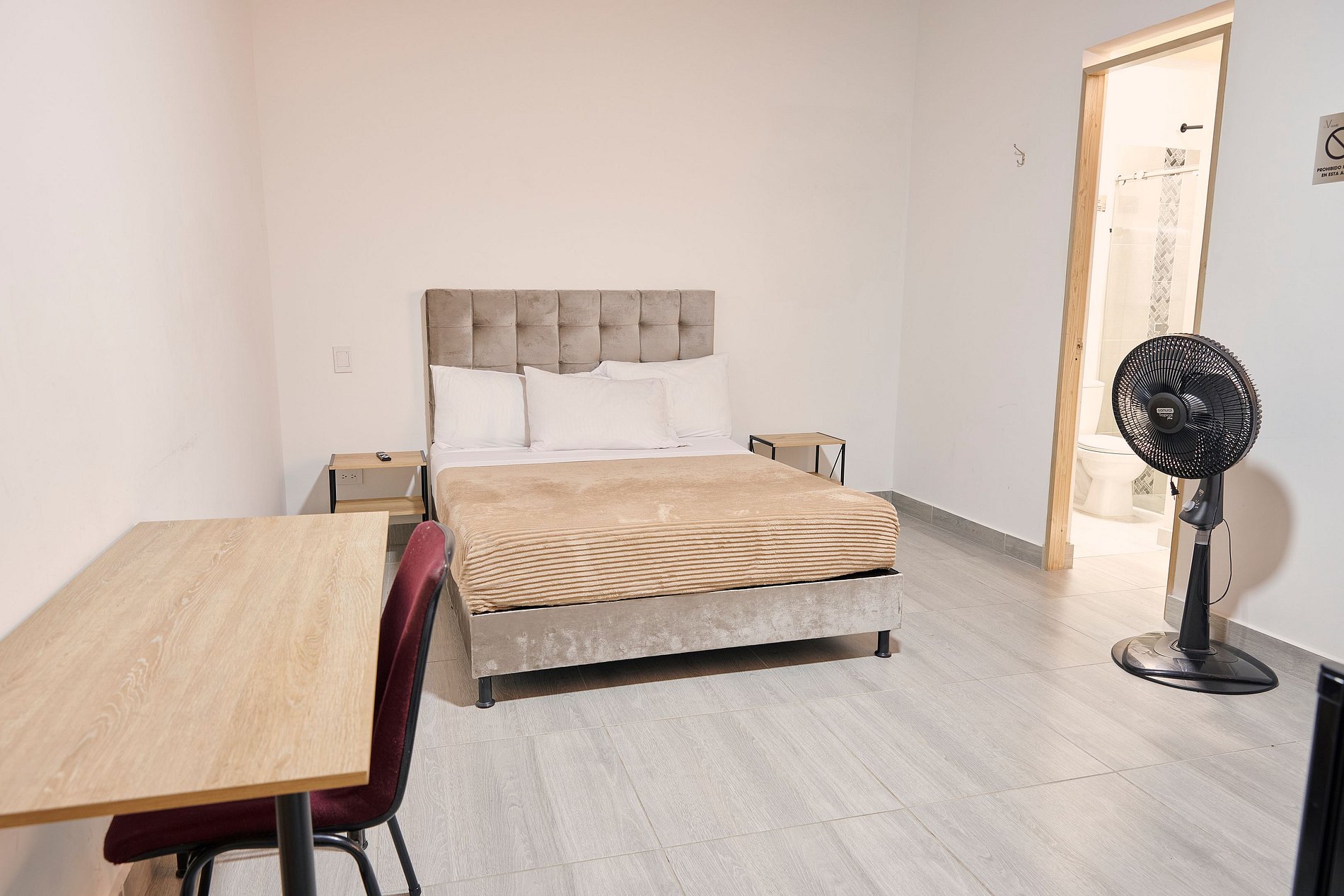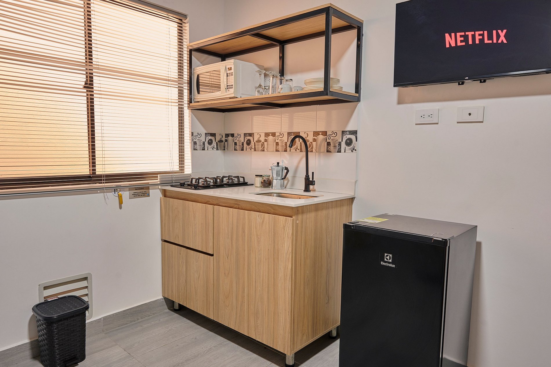 Este espacio ofrece todo el confort que necesitas. Dispone de una cama doble de 1.40 cm con mesa de noche, y un baño privado con agua caliente, equipado con toallas, papel higiénico y jabón corporal. La cocina, que funciona con gas natural, está totalmente equipada con microondas, nevera, ollas, vasos, copas, utensilios de cocina, vajilla completa, y una cafetera con suministro de café y azúcar para tu comodidad. Además, el apartamento cuenta con un televisor de 32 pulgadas con suscripción a Netflix y canales de aire. El clóset incluye ganchos para la ropa, y también dispones de un comedor y una mesa de trabajo para mayor funcionalidad.