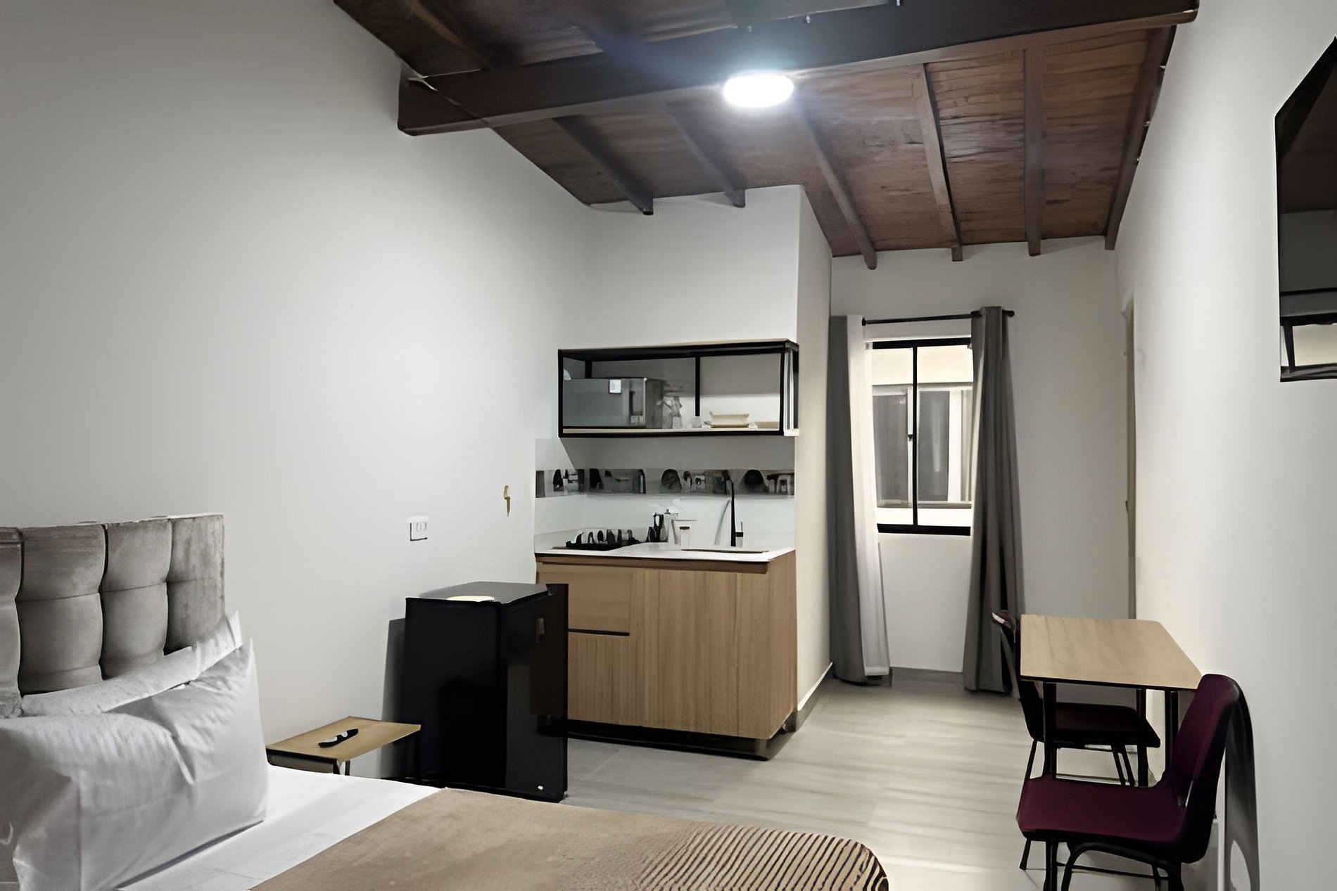 Este espacio ofrece todo el confort que necesitas. Dispone de una cama doble de 1.40 cm con mesa de noche, y un baño privado con agua caliente, equipado con toallas, papel higiénico y jabón corporal. La cocina, que funciona con gas natural, está totalmente equipada con microondas, nevera, ollas, vasos, copas, utensilios de cocina, vajilla completa, y una cafetera con suministro de café y azúcar para tu comodidad. Además, el apartamento cuenta con un televisor de 32 pulgadas con suscripción a Netflix y canales de aire. El clóset incluye ganchos para la ropa, y también dispones de un comedor y una mesa de trabajo para mayor funcionalidad.