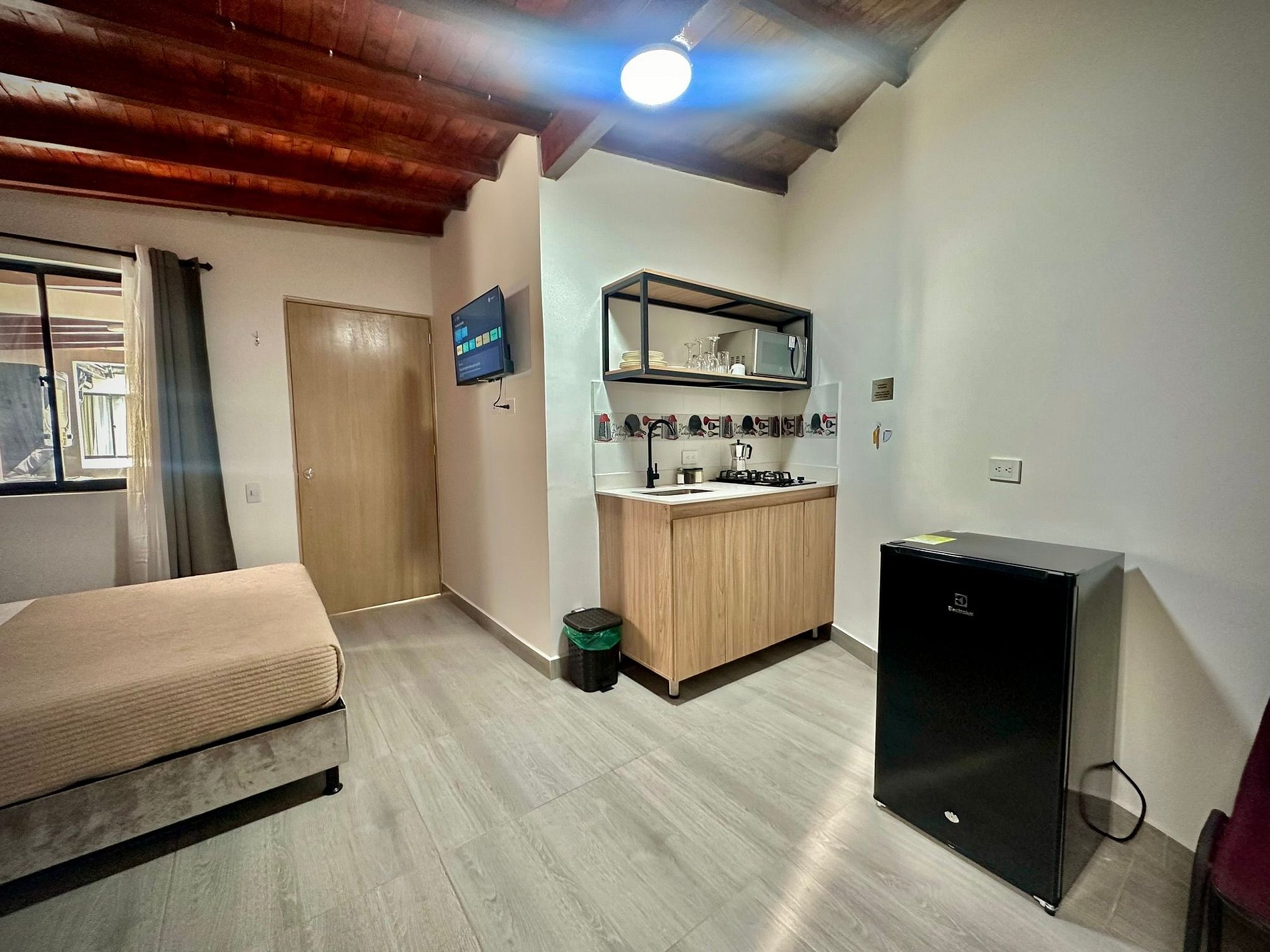 Este espacio ofrece todo el confort que necesitas. Dispone de una cama doble de 1.40 cm con mesa de noche, y un baño privado con agua caliente, equipado con toallas, papel higiénico y jabón corporal. La cocina, que funciona con gas natural, está totalmente equipada con microondas, nevera, ollas, vasos, copas, utensilios de cocina, vajilla completa, y una cafetera con suministro de café y azúcar para tu comodidad. Además, el apartamento cuenta con un televisor de 32 pulgadas con suscripción a Netflix y canales de aire. El clóset incluye ganchos para la ropa, y también dispones de un comedor y una mesa de trabajo para mayor funcionalidad.